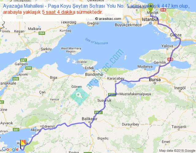 Ayazağa Mahallesi - Paşa Koyu Şeytan Sofrası Yolu No: 1 arası yaklaşık olarak 90 km/h ile yukarıda belirtilen sürede olup, iki yerin kuş uçuşu uzaklığı (mesafesi) 283'dir. Eğer belirtilen yerler arasında uçak seferi var ise bu süre uçakla 26 dakika'ya kadar düşebilir. Yolculuk otobüsle 6 saat 35 dakika sürmektedir.