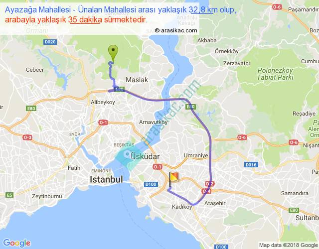 Ayazağa Mahallesi - Ünalan Mahallesi arası yaklaşık olarak 90 km/h ile yukarıda belirtilen sürede olup, iki yerin kuş uçuşu uzaklığı (mesafesi) 16'dir. Yolculuk otobüsle 45 dakika sürmektedir.