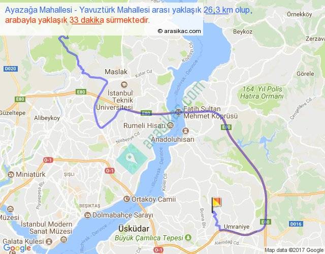 Ayazağa Mahallesi - Yavuztürk Mahallesi arası yaklaşık olarak 90 km/h ile yukarıda belirtilen sürede olup, iki yerin kuş uçuşu uzaklığı (mesafesi) 13'dir. Yolculuk otobüsle 42 dakika sürmektedir.