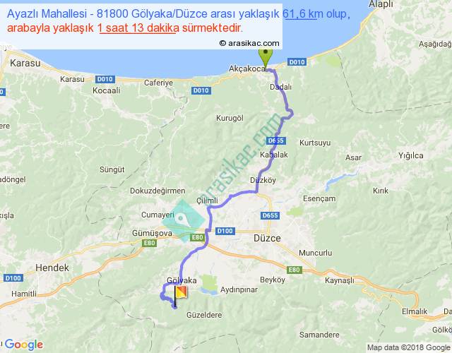 Ayazlı Mahallesi - 81800 Gölyaka Düzce arası yaklaşık olarak 90 km/h ile yukarıda belirtilen sürede olup, iki yerin kuş uçuşu uzaklığı (mesafesi) 41'dir. Yolculuk otobüsle 1 saat 34 dakika sürmektedir.