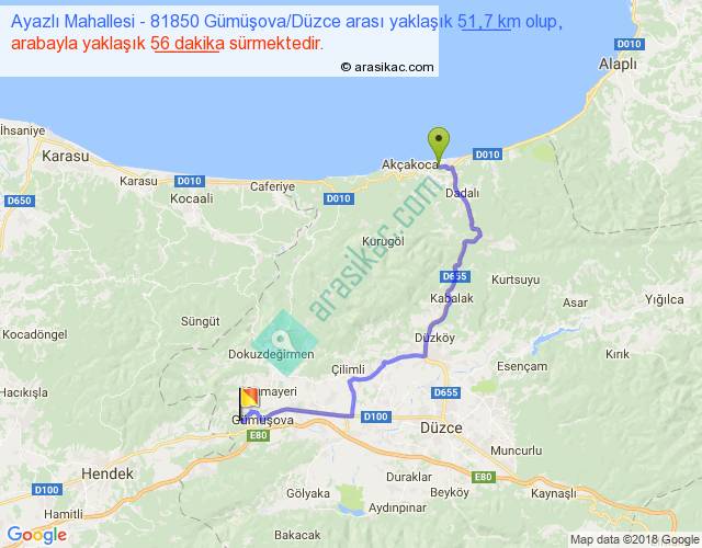 Ayazlı Mahallesi - 81850 Gümüşova Düzce arası yaklaşık olarak 90 km/h ile yukarıda belirtilen sürede olup, iki yerin kuş uçuşu uzaklığı (mesafesi) 34'dir. Yolculuk otobüsle 1 saat 12 dakika sürmektedir.