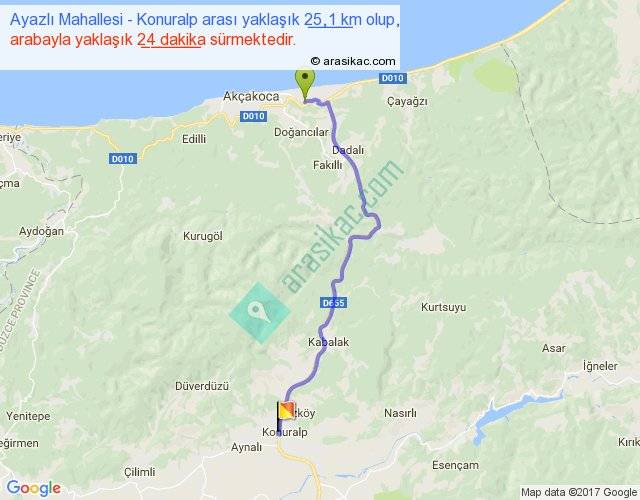Ayazlı Mahallesi - Konuralp arası yaklaşık olarak 90 km/h ile yukarıda belirtilen sürede olup, iki yerin kuş uçuşu uzaklığı (mesafesi) 19'dir. Yolculuk otobüsle 31 dakika sürmektedir.