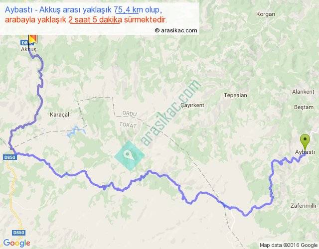 Aybastı - Akkuş arası yaklaşık olarak 90 km/h ile yukarıda belirtilen sürede olup, iki yerin kuş uçuşu uzaklığı (mesafesi) 34'dir. Yolculuk otobüsle 2 saat 42 dakika sürmektedir.