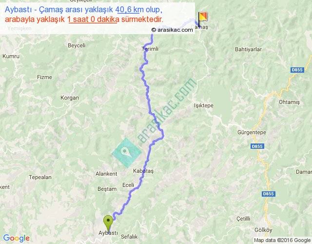 Aybastı - Çamaş arası yaklaşık olarak 90 km/h ile yukarıda belirtilen sürede olup, iki yerin kuş uçuşu uzaklığı (mesafesi) 26'dir. Yolculuk otobüsle 1 saat 18 dakika sürmektedir.
