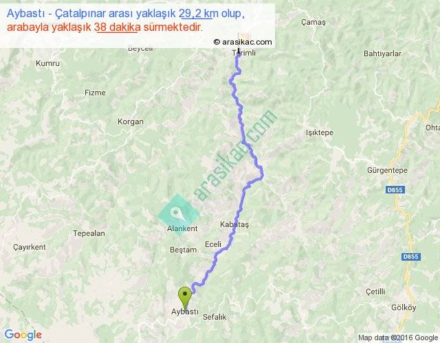 Aybastı - Çatalpınar arası yaklaşık olarak 90 km/h ile yukarıda belirtilen sürede olup, iki yerin kuş uçuşu uzaklığı (mesafesi) 22'dir. Yolculuk otobüsle 49 dakika sürmektedir.