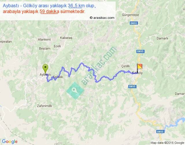 Aybastı - Gölköy arası yaklaşık olarak 90 km/h ile yukarıda belirtilen sürede olup, iki yerin kuş uçuşu uzaklığı (mesafesi) 18'dir. Yolculuk otobüsle 1 saat 16 dakika sürmektedir.