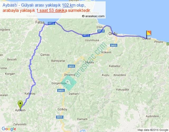 Aybastı - Gülyalı arası yaklaşık olarak 90 km/h ile yukarıda belirtilen sürede olup, iki yerin kuş uçuşu uzaklığı (mesafesi) 63'dir. Yolculuk otobüsle 2 saat 26 dakika sürmektedir.