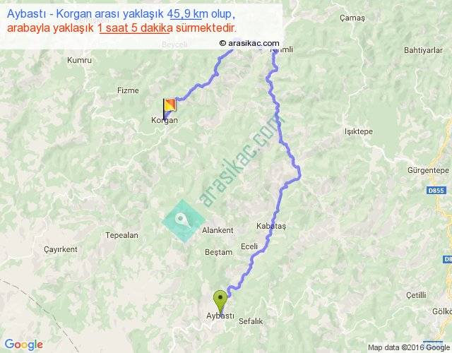 Aybastı - Korgan arası yaklaşık olarak 90 km/h ile yukarıda belirtilen sürede olup, iki yerin kuş uçuşu uzaklığı (mesafesi) 17'dir. Yolculuk otobüsle 1 saat 24 dakika sürmektedir.