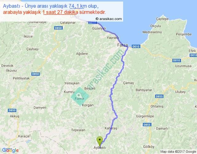 Aybastı - Ünye arası yaklaşık olarak 90 km/h ile yukarıda belirtilen sürede olup, iki yerin kuş uçuşu uzaklığı (mesafesi) 50'dir. Yolculuk otobüsle 1 saat 54 dakika sürmektedir.