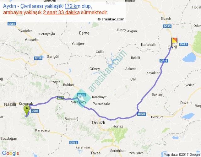 Aydın - Çivril arası yaklaşık olarak 90 km/h ile yukarıda belirtilen sürede olup, iki yerin kuş uçuşu uzaklığı (mesafesi) 123'dir. Yolculuk otobüsle 3 saat 18 dakika sürmektedir.