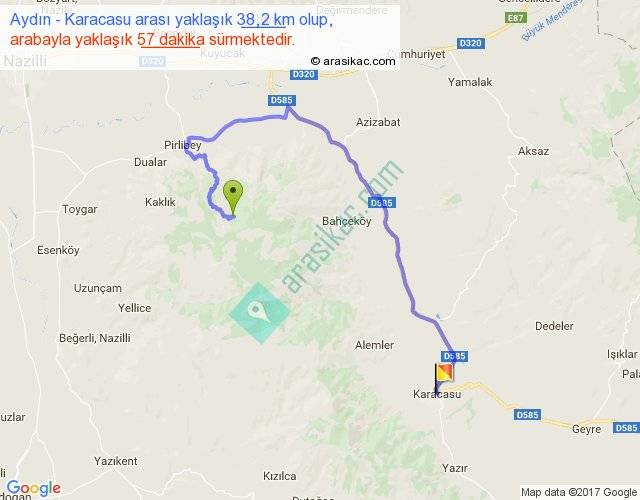 Aydın - Karacasu arası yaklaşık olarak 90 km/h ile yukarıda belirtilen sürede olup, iki yerin kuş uçuşu uzaklığı (mesafesi) 68'dir. Yolculuk otobüsle 1 saat 45 dakika sürmektedir.