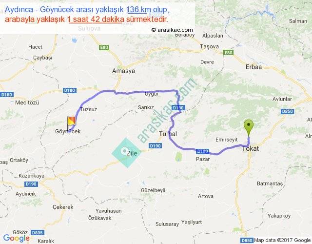 Aydınca - Göynücek arası yaklaşık olarak 90 km/h ile yukarıda belirtilen sürede olup, iki yerin kuş uçuşu uzaklığı (mesafesi) 86'dir. Yolculuk otobüsle 2 saat 12 dakika sürmektedir.