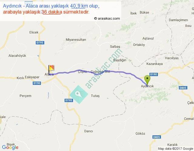 Aydıncık - Alaca arası yaklaşık olarak 90 km/h ile yukarıda belirtilen sürede olup, iki yerin kuş uçuşu uzaklığı (mesafesi) 38'dir. Yolculuk otobüsle 46 dakika sürmektedir.