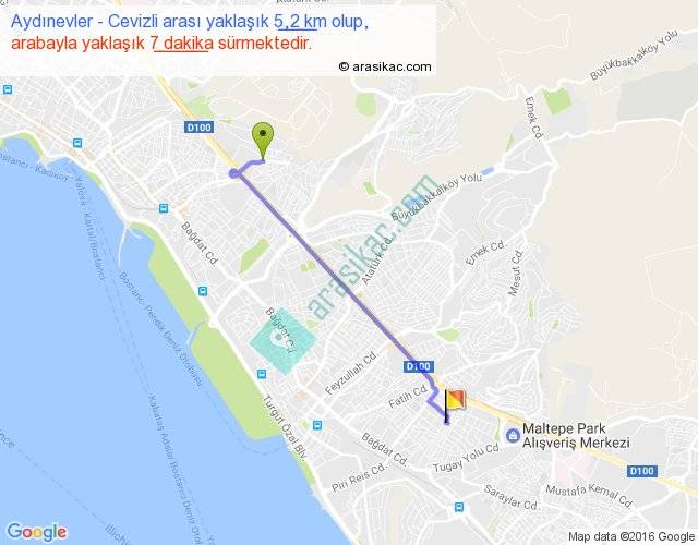 Aydınevler - Cevizli arası yaklaşık olarak 90 km/h ile yukarıda belirtilen sürede olup, iki yerin kuş uçuşu uzaklığı (mesafesi) 4'dir. Yolculuk otobüsle 9 dakika sürmektedir.