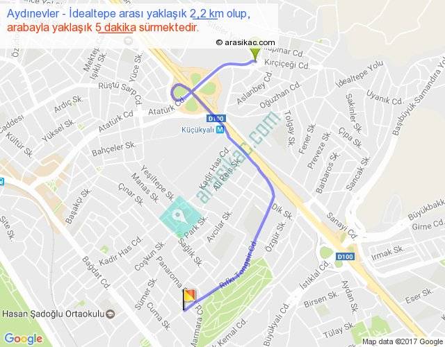 Aydınevler - İdealtepe arası yaklaşık olarak 90 km/h ile yukarıda belirtilen sürede olup, iki yerin kuş uçuşu uzaklığı (mesafesi) 1'dir. Yolculuk otobüsle 6 dakika sürmektedir.