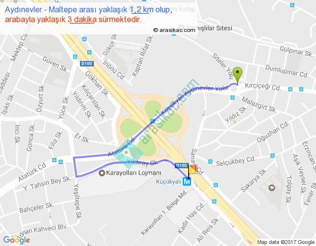 Aydınevler - Maltepe arası yaklaşık olarak 90 km/h ile yukarıda belirtilen sürede olup, iki yerin kuş uçuşu uzaklığı (mesafesi) 0'dir. Yolculuk otobüsle 3 dakika sürmektedir.