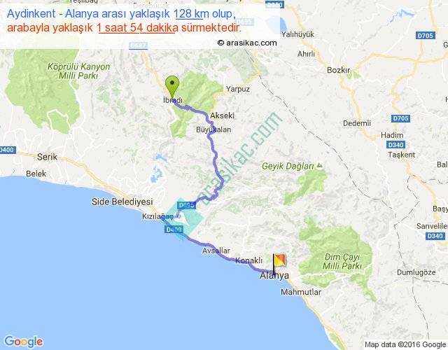 Aydinkent - Alanya arası yaklaşık olarak 90 km/h ile yukarıda belirtilen sürede olup, iki yerin kuş uçuşu uzaklığı (mesafesi) 70'dir. Yolculuk otobüsle 2 saat 28 dakika sürmektedir.