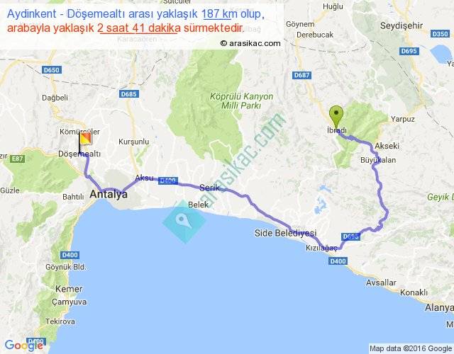 Aydinkent - Döşemealtı arası yaklaşık olarak 90 km/h ile yukarıda belirtilen sürede olup, iki yerin kuş uçuşu uzaklığı (mesafesi) 88'dir. Yolculuk otobüsle 3 saat 29 dakika sürmektedir.