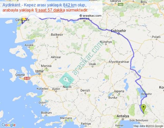 Aydinkent - Kepez arası yaklaşık olarak 90 km/h ile yukarıda belirtilen sürede olup, iki yerin kuş uçuşu uzaklığı (mesafesi) 558'dir. Eğer belirtilen yerler arasında uçak seferi var ise bu süre uçakla 51 dakika'ya kadar düşebilir. Yolculuk otobüsle 12 saat 56 dakika sürmektedir.
