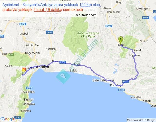 Aydinkent - Konyaaltı Antalya arası yaklaşık olarak 90 km/h ile yukarıda belirtilen sürede olup, iki yerin kuş uçuşu uzaklığı (mesafesi) 102'dir. Yolculuk otobüsle 3 saat 39 dakika sürmektedir.