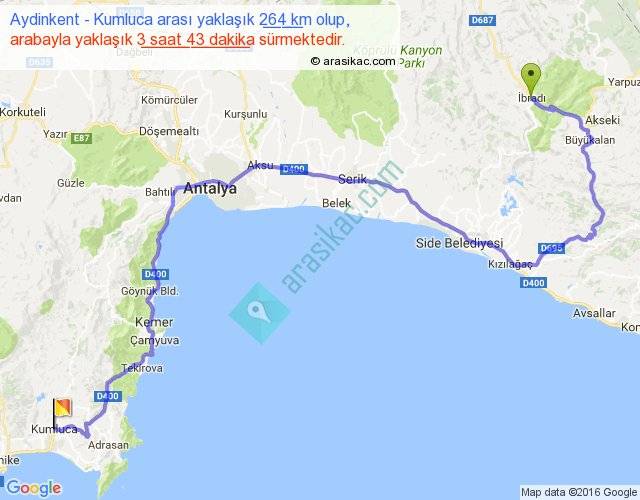 Aydinkent - Kumluca arası yaklaşık olarak 90 km/h ile yukarıda belirtilen sürede olup, iki yerin kuş uçuşu uzaklığı (mesafesi) 141'dir. Yolculuk otobüsle 4 saat 49 dakika sürmektedir.