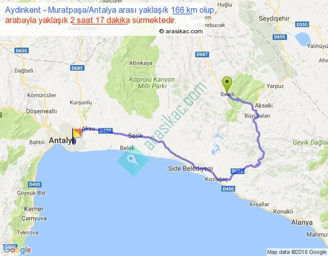 Aydinkent - Muratpaşa Antalya arası yaklaşık olarak 90 km/h ile yukarıda belirtilen sürede olup, iki yerin kuş uçuşu uzaklığı (mesafesi) 76'dir. Yolculuk otobüsle 2 saat 58 dakika sürmektedir.