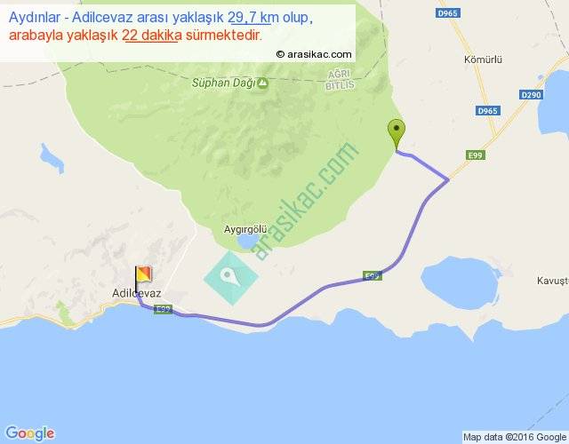 Aydınlar - Adilcevaz arası yaklaşık olarak 90 km/h ile yukarıda belirtilen sürede olup, iki yerin kuş uçuşu uzaklığı (mesafesi) 20'dir. Yolculuk otobüsle 28 dakika sürmektedir.