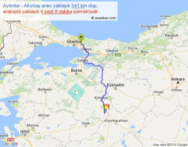 Aydınlar - Altıntaş arası yaklaşık olarak 90 km/h ile yukarıda belirtilen sürede olup, iki yerin kuş uçuşu uzaklığı (mesafesi) 229'dir. Yolculuk otobüsle 5 saat 22 dakika sürmektedir.