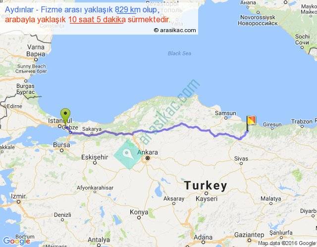 Aydınlar - Fizme arası yaklaşık olarak 90 km/h ile yukarıda belirtilen sürede olup, iki yerin kuş uçuşu uzaklığı (mesafesi) 675'dir. Eğer belirtilen yerler arasında uçak seferi var ise bu süre uçakla 1 saat 02 dakika'ya kadar düşebilir. Yolculuk otobüsle 13 saat 6 dakika sürmektedir.
