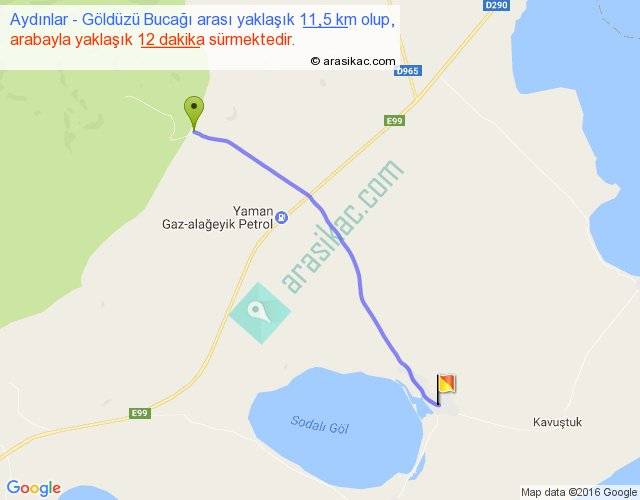 Aydınlar - Göldüzü Bucağı arası yaklaşık olarak 90 km/h ile yukarıda belirtilen sürede olup, iki yerin kuş uçuşu uzaklığı (mesafesi) 11'dir. Yolculuk otobüsle 15 dakika sürmektedir.
