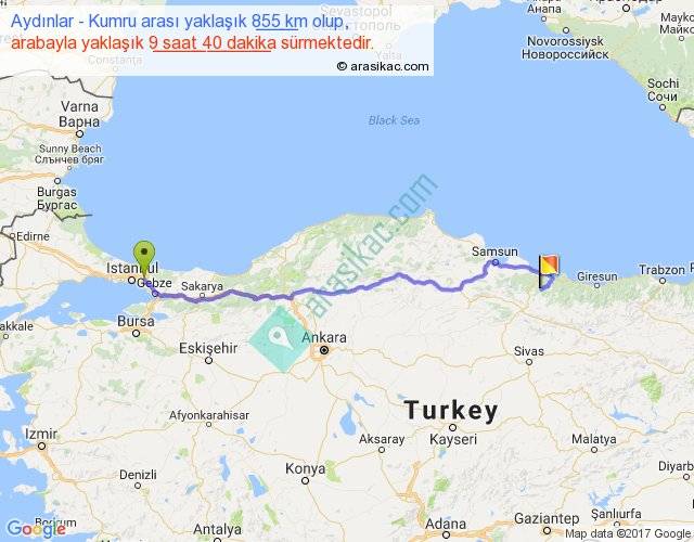Aydınlar - Kumru arası yaklaşık olarak 90 km/h ile yukarıda belirtilen sürede olup, iki yerin kuş uçuşu uzaklığı (mesafesi) 671'dir. Eğer belirtilen yerler arasında uçak seferi var ise bu süre uçakla 1 saat 01 dakika'ya kadar düşebilir. Yolculuk otobüsle 12 saat 34 dakika sürmektedir.