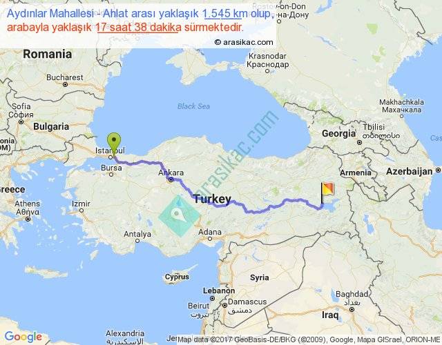 Aydınlar Mahallesi - Ahlat arası yaklaşık olarak 90 km/h ile yukarıda belirtilen sürede olup, iki yerin kuş uçuşu uzaklığı (mesafesi) 1151'dir. Eğer belirtilen yerler arasında uçak seferi var ise bu süre uçakla 1 saat 46 dakika'ya kadar düşebilir. Yolculuk otobüsle 22 saat 55 dakika sürmektedir.