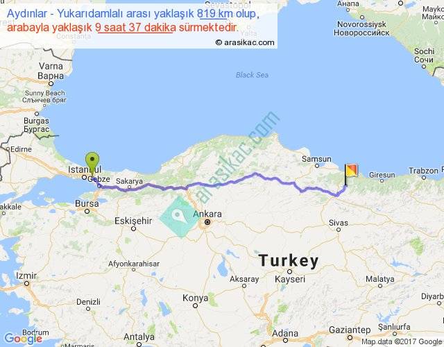 Aydınlar - Yukarıdamlalı arası yaklaşık olarak 90 km/h ile yukarıda belirtilen sürede olup, iki yerin kuş uçuşu uzaklığı (mesafesi) 671'dir. Eğer belirtilen yerler arasında uçak seferi var ise bu süre uçakla 1 saat 01 dakika'ya kadar düşebilir. Yolculuk otobüsle 12 saat 30 dakika sürmektedir.