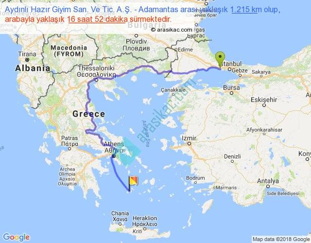 Aydınlı Hazır Giyim San. Ve Tic. A.Ş. - Adamantas arası yaklaşık olarak 90 km/h ile yukarıda belirtilen sürede olup, iki yerin kuş uçuşu uzaklığı (mesafesi) 591'dir. Eğer belirtilen yerler arasında uçak seferi var ise bu süre uçakla 54 dakika'ya kadar düşebilir. Yolculuk otobüsle 21 saat 55 dakika sürmektedir.