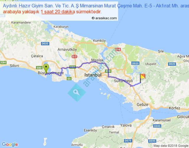 Aydınlı Hazır Giyim San. Ve Tic. A.Ş Mimarsinan Murat Çeşme Mah. E-5 - Akfırat Mh. arası yaklaşık olarak 90 km/h ile yukarıda belirtilen sürede olup, iki yerin kuş uçuşu uzaklığı (mesafesi) 73'dir. Yolculuk otobüsle 1 saat 44 dakika sürmektedir.