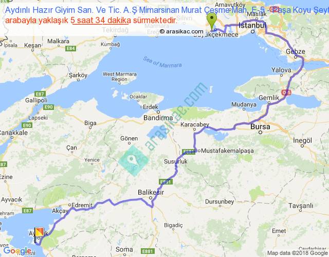 Aydınlı Hazır Giyim San. Ve Tic. A.Ş Mimarsinan Murat Çeşme Mah. E-5 - Paşa Koyu Şeytan Sofrası Yolu No: 1 arası yaklaşık olarak 90 km/h ile yukarıda belirtilen sürede olup, iki yerin kuş uçuşu uzaklığı (mesafesi) 249'dir. Yolculuk otobüsle 7 saat 14 dakika sürmektedir.