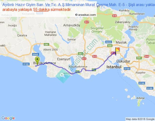 Aydınlı Hazır Giyim San. Ve Tic. A.Ş Mimarsinan Murat Çeşme Mah. E-5 - Şişli arası yaklaşık olarak 90 km/h ile yukarıda belirtilen sürede olup, iki yerin kuş uçuşu uzaklığı (mesafesi) 37'dir. Yolculuk otobüsle 1 saat 11 dakika sürmektedir.
