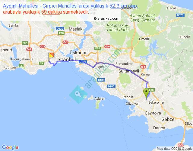 Aydınlı Mahallesi - Çırpıcı Mahallesi arası yaklaşık olarak 90 km/h ile yukarıda belirtilen sürede olup, iki yerin kuş uçuşu uzaklığı (mesafesi) 40'dir. Yolculuk otobüsle 1 saat 16 dakika sürmektedir.