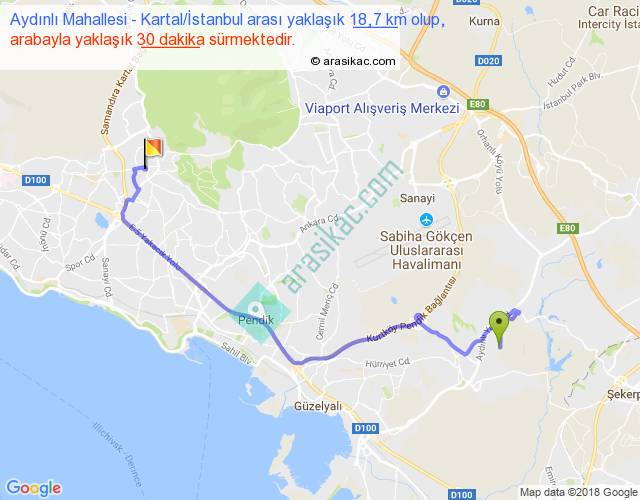 Aydınlı Mahallesi - Kartal İstanbul arası yaklaşık olarak 90 km/h ile yukarıda belirtilen sürede olup, iki yerin kuş uçuşu uzaklığı (mesafesi) 11'dir. Yolculuk otobüsle 39 dakika sürmektedir.