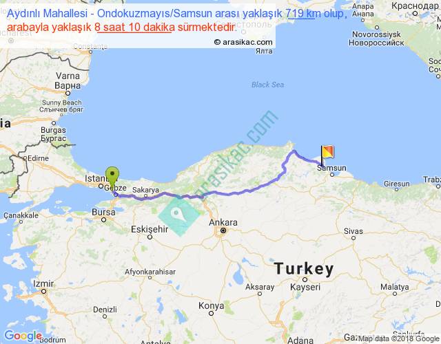 Aydınlı Mahallesi - Ondokuzmayıs Samsun arası yaklaşık olarak 90 km/h ile yukarıda belirtilen sürede olup, iki yerin kuş uçuşu uzaklığı (mesafesi) 560'dir. Eğer belirtilen yerler arasında uçak seferi var ise bu süre uçakla 51 dakika'ya kadar düşebilir. Yolculuk otobüsle 10 saat 37 dakika sürmektedir.
