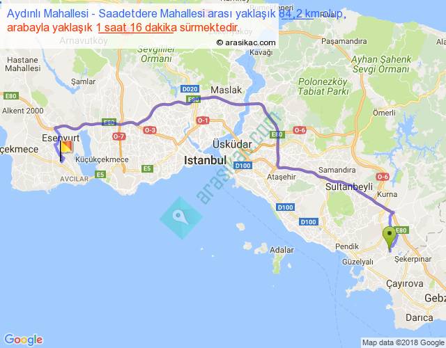 Aydınlı Mahallesi - Saadetdere Mahallesi arası yaklaşık olarak 90 km/h ile yukarıda belirtilen sürede olup, iki yerin kuş uçuşu uzaklığı (mesafesi) 56'dir. Yolculuk otobüsle 1 saat 38 dakika sürmektedir.
