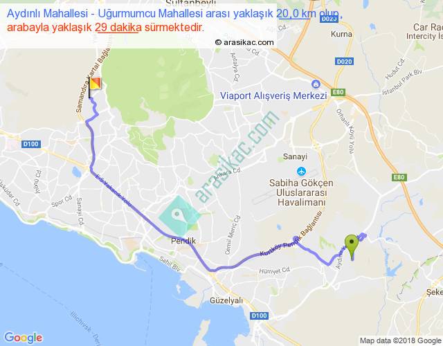 Aydınlı Mahallesi - Uğurmumcu Mahallesi arası yaklaşık olarak 90 km/h ile yukarıda belirtilen sürede olup, iki yerin kuş uçuşu uzaklığı (mesafesi) 13'dir. Yolculuk otobüsle 37 dakika sürmektedir.