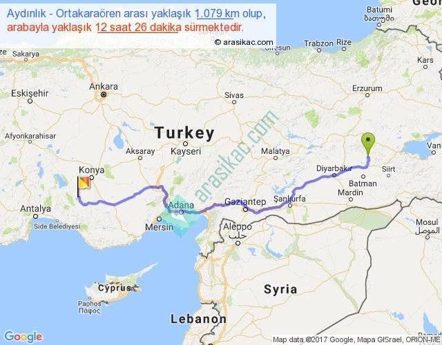 Aydınlık - Ortakaraören arası yaklaşık olarak 90 km/h ile yukarıda belirtilen sürede olup, iki yerin kuş uçuşu uzaklığı (mesafesi) 810'dir. Eğer belirtilen yerler arasında uçak seferi var ise bu süre uçakla 1 saat 14 dakika'ya kadar düşebilir. Yolculuk otobüsle 16 saat 9 dakika sürmektedir.
