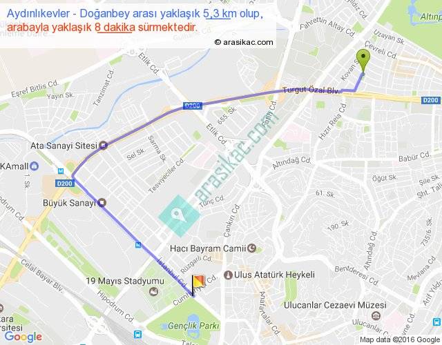 Aydınlıkevler - Doğanbey arası yaklaşık olarak 90 km/h ile yukarıda belirtilen sürede olup, iki yerin kuş uçuşu uzaklığı (mesafesi) 3'dir. Yolculuk otobüsle 10 dakika sürmektedir.