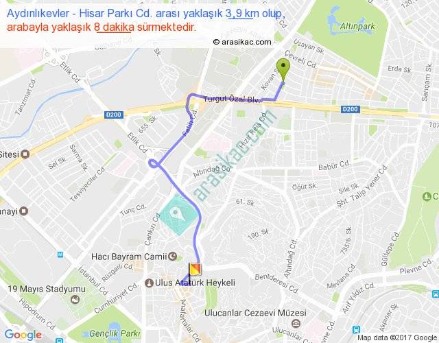 Aydınlıkevler - Hisar Parkı Cd. arası yaklaşık olarak 90 km/h ile yukarıda belirtilen sürede olup, iki yerin kuş uçuşu uzaklığı (mesafesi) 2'dir. Yolculuk otobüsle 10 dakika sürmektedir.