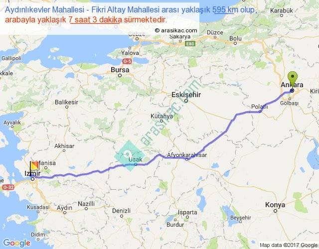 Aydınlıkevler Mahallesi - Fikri Altay Mahallesi arası yaklaşık olarak 90 km/h ile yukarıda belirtilen sürede olup, iki yerin kuş uçuşu uzaklığı (mesafesi) 521'dir. Eğer belirtilen yerler arasında uçak seferi var ise bu süre uçakla 48 dakika'ya kadar düşebilir. Yolculuk otobüsle 9 saat 9 dakika sürmektedir.