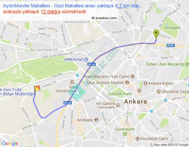Aydınlıkevler Mahallesi - Gazi Mahallesi arası yaklaşık olarak 90 km/h ile yukarıda belirtilen sürede olup, iki yerin kuş uçuşu uzaklığı (mesafesi) 7'dir. Yolculuk otobüsle 15 dakika sürmektedir.