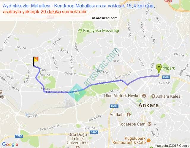 Aydınlıkevler Mahallesi - Kentkoop Mahallesi arası yaklaşık olarak 90 km/h ile yukarıda belirtilen sürede olup, iki yerin kuş uçuşu uzaklığı (mesafesi) 12'dir. Yolculuk otobüsle 26 dakika sürmektedir.