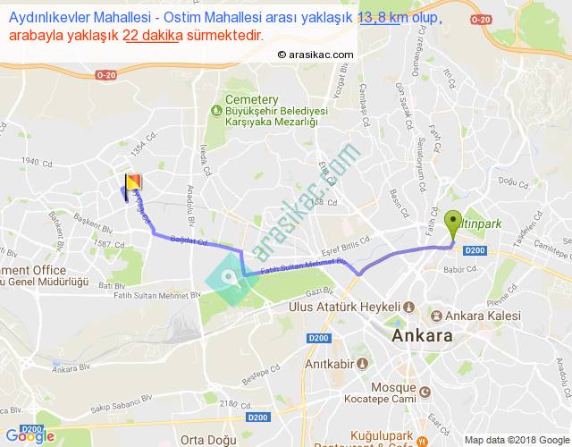 Aydınlıkevler Mahallesi - Ostim Mahallesi arası yaklaşık olarak 90 km/h ile yukarıda belirtilen sürede olup, iki yerin kuş uçuşu uzaklığı (mesafesi) 11'dir. Yolculuk otobüsle 28 dakika sürmektedir.