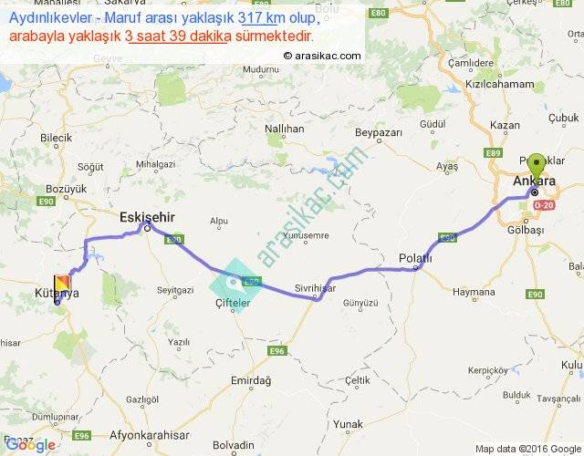 Aydınlıkevler - Maruf arası yaklaşık olarak 90 km/h ile yukarıda belirtilen sürede olup, iki yerin kuş uçuşu uzaklığı (mesafesi) 254'dir. Eğer belirtilen yerler arasında uçak seferi var ise bu süre uçakla 23 dakika'ya kadar düşebilir. Yolculuk otobüsle 4 saat 44 dakika sürmektedir.